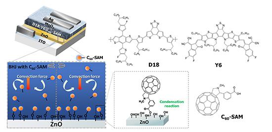 연구팀은 단분자 물질인 풀러렌 기반 자기조립 소재를 산화아연 위에 도포해 스스로 보호층을 형성하게 함으로써 산화아연의 안정성을 확보하고 전지의 효율과 수명을 개선했을 뿐만 아니라 코팅 공정을 간소화하는 데도 성공했다.