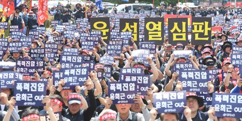 한국노동조합총연맹 조합원들이 7일 전남 광양시 금호동 포스코 광양제철소 앞에서 \'대정부 투쟁 결의대회\'를 열고 있다. 한국노총은 이날 포스코 하청노동자 연대 \'망루 농성\' 과정에서 빚어진 경찰의 강경 진압에 반발, 경제사회노동위원회 참여를 중단키로 결정했다.