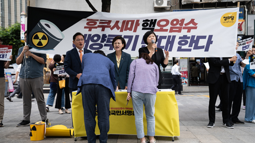 이정미 정의당 대표 등이 8일 서울 영등포구 여의도역 앞에서 후쿠시마 오염수 해양투기 저지 정의당 정당연설회 및 서명운동을 진행하고 있다. /정의당 제공