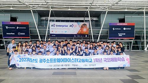 8일 광주소프트웨어마이스터고에 따르면 이번 체험학습은 학생들은 글로벌 정보통신기술의 트랜드를 경험하고 전문가 특강을 통해 진로를 모색하기 위해 마련됐다. 1학년 학생과 최홍진 교장과 인솔 교사 7명을 포함 총 80명이 이번 체험에 참가했다.