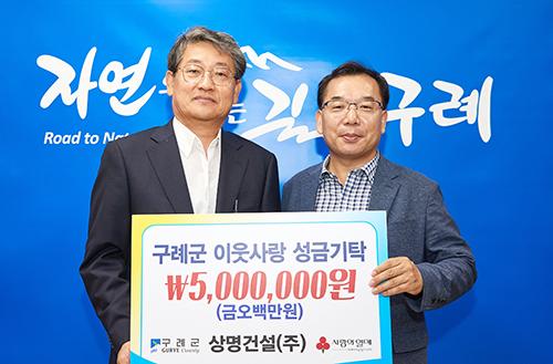 상명건설(주) 서동찬 대표이사는 “관내 어려운 이웃에게 조금이나마 도움이 될 수 있기를 바라는 마음에 성금을 준비했다”며 “앞으로도 구례지역 주민과 함께 나눔을 지속적으로 이어가겠다”고 말했다.