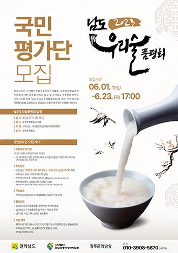 전남도가 우수한 지역 농산물로 만든 명품 남도 술을 발굴해 대외 인지도를 높이고 생산자 의욕 고취를 위한 \'2023 남도 우리술 품평회\' 참가 업체와 국민평가단을 모집한다.