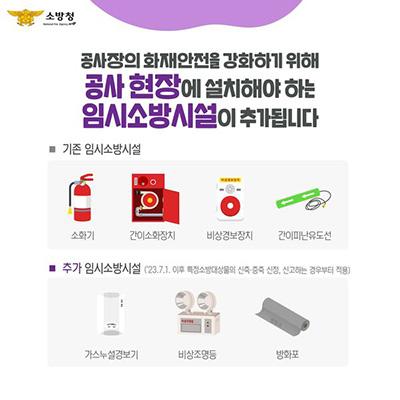 김종률 방호예방과장은 “오는 7월부터 강화된 임시소방시설을 통해 화재 없는 안전한 공사현장으로 안심도시의 기반을 다져가겠다”고 말했다.