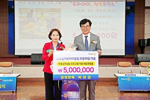 박미경 장흥청아로타리클럽 신임회장이 9일 장흥군 아동을 위해 써달라며 성금 500만원을 기부했다.