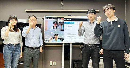 왼쪽부터 지스트 송윤아 학생, 김홍국 교수, 김지원·손상원 학생. 화면 위 송일훈 환화비전 연구원, 아래 임정은 한화비전 수석연구원.