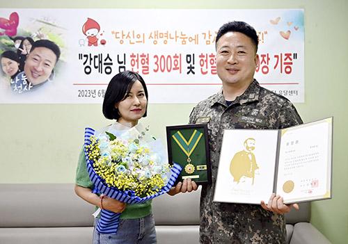 강 상사는 13일 목포시 헌혈의집 유달센터에서 300번째 헌혈에 참여해 대한적십자사로부터 \'최고명예대장\'을 수여받는 영예를 안았다.