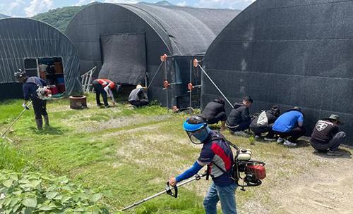 이날 직원들은 표고버섯 재배지 내 예초작업, 잡목 관리, 주변 환경정비 등을 도왔고, 고온기 병해충 발생을 대비해 친환경 방제제를 이용해 연무소독을 실시했다.