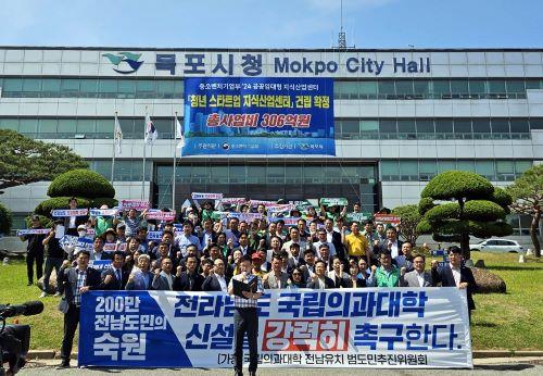 이들은 이날 오후 목포시청 앞에서 기자회견을 갖고 \"최근 정부와 대한의사협회가 의과대 정원 확대에 합의하고도 대한의사협회의 의대신설 불가 입장으로 전남권 의대설립 전망이 불투명해졌다\"면서 이같이 강조했다.