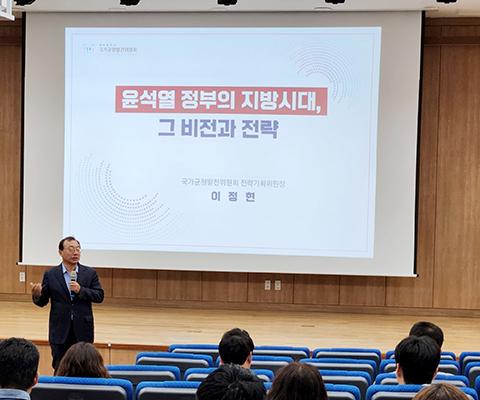 이 위원장은 수도권 쏠림 현상과 비수도권 지방 소멸 위기감이 확대됨에 따라 지방주도의 분권형 균형발전을 목표로 하는 5대 지방시대 핵심과제에 대해 강연했다.
