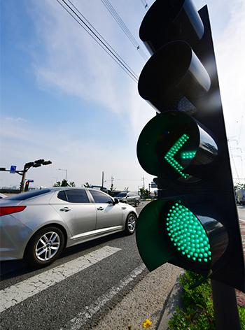 16일 오후 광주 북구 월출교차로에 세워진 높이 2m 가량의 운전자용 신호등 주변으로 한 차량이 지나고 있다.2023.06.16
