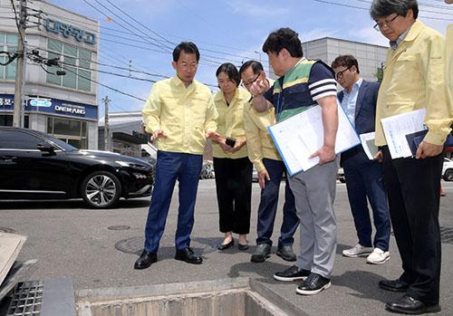문영훈 광주시행정부시장이 23일 오후 서구 쌍촌동 상습침수지역을 방문해 현장을 점검하고 관계자에게 장마철 대비 철저한 준비로 시민 피해가 발생하지 않도록 예방활동에 최선을 다해달라고 당부하고 있다./광주시 제공
