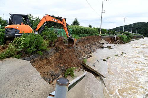이날 오전 5시 30분께 논밭을 살피러 나간 한 주민이 제방 일부가 불어난 물에 떠내려갔다고 신고했다.