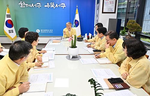 김이강 서구청장은 이날 오전 긴급 간부회의를 개최하고 “주민의 생명과 재산 보호와 직결되어 있는 안전만큼은 다른 자치구보다 선제적 대응이 필요하다”고 강조하며 “본청과 18개 동 공무원들은 최소한의 인원을 제외하고 담당 시설 및 현장에서 비 피해 상황을 점검하고 예찰 활동을 강화하라”고 지시했다.