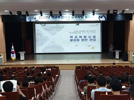 전남도교육청은 27일 무안군 남악복합주민센터에서 시·군 교육지원청과 자치단체 업무관계자, 학교장 등 170여 명이 참석한 가운데 ‘2023년 학교복합시설 공모사업 설명회’를 개최했다.