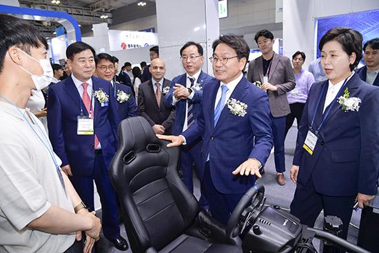 강기정 광주시장이 29일 오후 서구 김대중컨벤션센터에서 열린 ‘2023 광주미래산업엑스포 개막식’에 참석해 내빈들과 현대자동차의 컨셉트카를 살펴보고 있다. /광주시 제공
