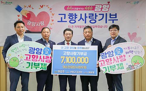 광양시는 재순천광양시향우회 회장단 4명이 내 고향 광양의 미래와 발전을 응원하며 고향사랑기부금 710만원을 기탁했다고 2일 밝혔다.