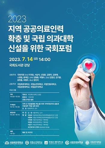 목포대학교·순천대학교·안동대학교·창원대학교·공주대학교가 공동 주관하고 해당 지역 국회의원 14명이 공동 주최하는 \'지역 공공의료인력 확충 및 국립 의과대학 신설 촉구 국회포럼\'이 오는 14일 국회도서관 강당에서 개최된다.