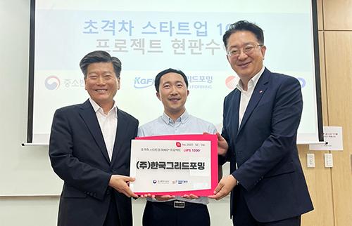 광주·전남중기청장 조종래(왼쪽)과 한국전력 백수현 상생생태계조성처장(오른쪽)이 초격차 스타트업 선정기업 현판을 (주)한국그리드포밍 강지성 대표(가운데)에게 수여중이다. /광주전남중기청 제공
