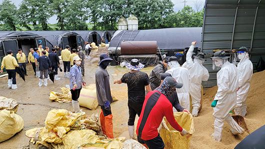 이렇게 사전 조치를 마친 축사에 도착한 군 장병들은, 왕겨 등을 깔아 다시 오리를 사육할 수 있는 환경을 만들고, 주변 배수로도 정비했다.
