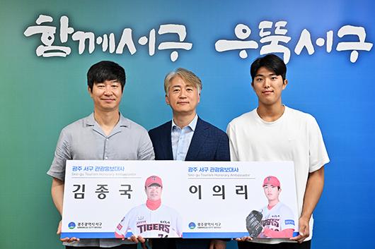 스포츠 스타인 기아타이거즈 김종국 감독과 이의리 선수가 광주광역시 서구의 대표 얼굴이 됐다. 서구는 20일 오전 이들을 ‘1호 관광홍보대사’로 위촉했다고 밝혔다.