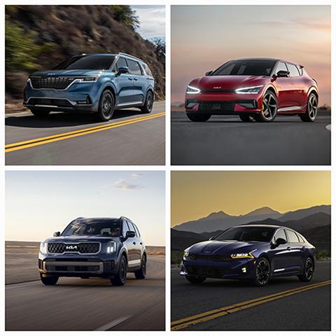 기아가 미국 시장조사업체 JD파워의 \'2023 상품성 만족도\' 조사에서 7개 차종이 차급별 1위에 올랐다. 사진은 이번 조사에서 차급별 1위에 오른 (왼쪽 위부터 시계방향으로) 기아 카니발, EV6, K5, 텔루라이드 모습. (사진=기아 제공) 2023.07.21