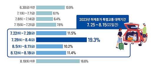 휴가 여행 출발 예정 일자는 오는 29일부터 8월4일(19.3%), 여행 예정지역은 동해안권(24.2%), 교통수단은 승용차(84.7%)가 가장 많을 것으로 예상된다.