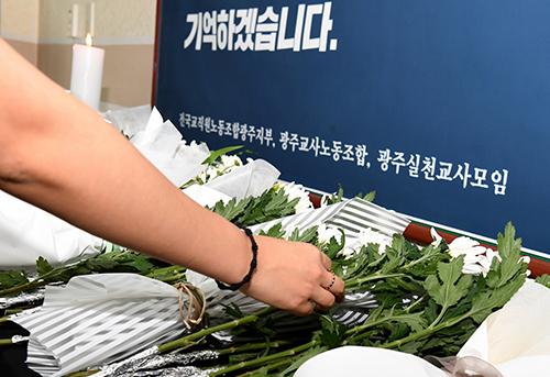 21일 오후 광주 광산구 신창동 광주교원연수원에서 한 교사가 안타깝게 숨진 서울 교사 추모 공간에 헌화하고 있다. 이 추모 공간은 지난 18일 안타까운 선택으로 숨진 서울 서이초등학교 20대 담임교사를 애도하고자 설치됐다. 2023.07.21.