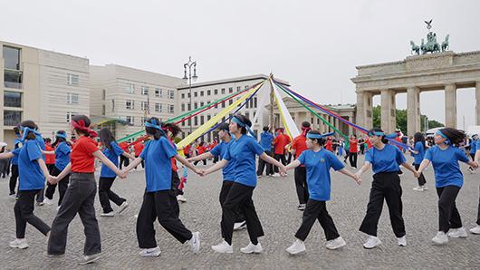 전남지역 학생들이 독일 베를린에서 \'세계 평화와 안녕\'을 기원하며 전통놀이 강강술래와 단심줄놀이 퍼포먼스를 펼쳤다.