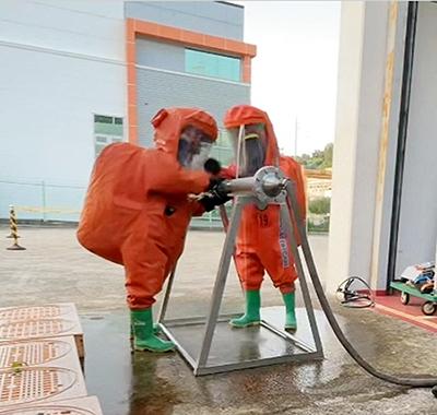 훈련 내용은 ▲화학물질 식별 및 정보확인 ▲A급 보호복 착용 후 인명구조 ▲누출방지 배수백 및 슬리브 등을 활용한 누출차단 ▲간이인체제독텐트 대원제독 등이다.