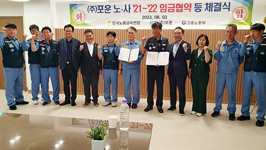 지난 3일 광양제철소 복지회관 2층에서 열린 조인식에는 김만재 전국금속노동종합연맹 위원장, 광양지역기계금속운수산업 노동조합 위원장, 박원수 ㈜포운 대표, 양정열 고용노동부 광주고용노동청장, 피해근 고용노동부여수지청장이 참석해 노사분규 종료를 축하했다.