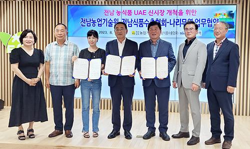 전농기원은 전날 농업기술원 내 청년창농타운에서 두바이 한국식품 유통·판매 수출업체인 나리무역과 UAE 신시장 개척을 위한 \'전남 농식품 수출 확대 업무협약\'을 체결했다고 8일 밝혔다.