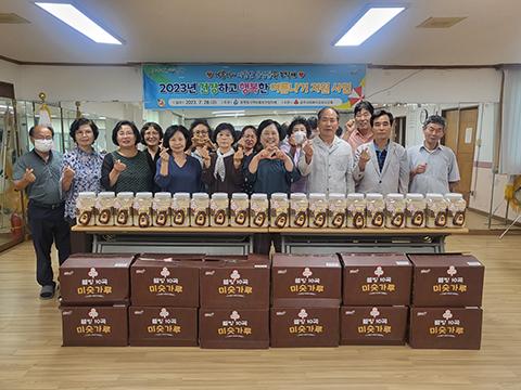 동명동 주민들과 착한가게의 자발적 기부로 마련된 이번 행사는 돌봄 이웃 100세대를 대상으로 미숫가루와 꿀을 방문 전달하면서, 혹서기 건강 수칙을 안내하는 등 폭염 대응 건강관리에 만전을 기했다.