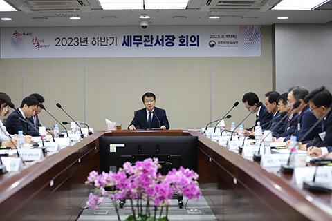 광주지방국세청은 17일 정부광주합동청사 대회의실에서 양동구 청장을 비롯해 지방청 국·과장, 일선 세무서장 등 36명이 참석한 가운데 \'2023년 하반기 광주국세청 세무관서장 회의\'를 개최했다.