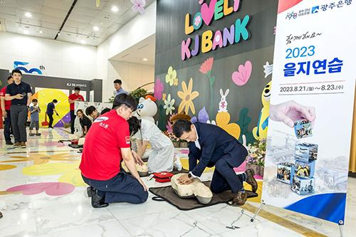 광주은행은 2023년 을지연습 기간 중 광주은행 임직원 및 지역민을 대상으로 본점 1층 로비에서 심폐소생술(CPR) 교육을 했다고 21일 밝혔다.