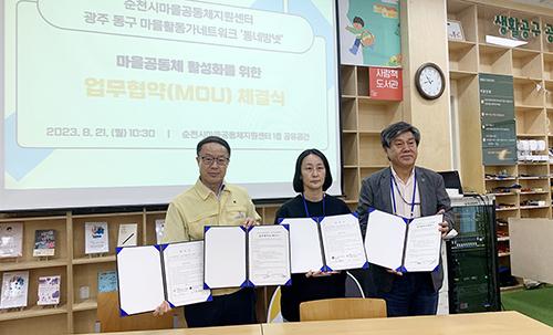 순천시 마을공동체지원센터는 지난 21일 광주 동구 푸른마을공동체센터와 마을활동가 네트워크 ‘동네방넷’과 공동체와 주민자치 활동 관련 상호 교류 및 협력 강화를 위한 업무협약을 체결했다.