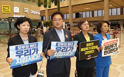 일본 후쿠시마 오염수 투기중단 방일단 국회의원들이 26일 서울 강서구 김포국제공항을 통해 일본으로 출국하기 앞서 기자회견 하고 있다.