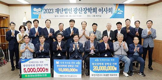 재단법인 광산장학회가 30일 오전 광산구청 2층 상황실에서 2023년 제2차 이사회를 개최한 가운데, 회의에 앞서 지역 인재 육성을 위한 장학금 전달식이 열렸다. 전달식에서 NH농협은행 광주본부는 1000만 원, 무진기연(주)는 2000만 원, 송정농업협동조합은 500만 원을 각각 기탁했다. /광주시 광산구 제공