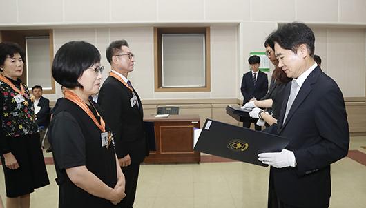 김대중 전남교육감(오른쪽)이 지난 28일 도교육청 대회의실에서 2023년 8월말 퇴직 교원에게 정부 훈포장을 전수하고 있다. /전남도교육청 제공