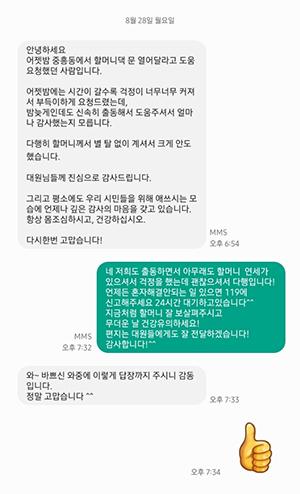 구조대 현장대원들도 \"연세가 있으셔서 걱정했는데 괜찮으셔서 다행이다. 혼자 해결 안 되는 일 있으면 119에 신고해주세요. 24시간 대기하고 있습니다. 지금처럼 할머니 잘 보살펴주시고 무더운 날 건강 유의하세요\"라고 진심 어린 답장을 보냈다.