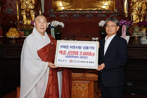 구례군은 지난달 30일 대한불교조계종 화엄사에서 관내 저소득 가정을 위해 백미 200포(10kg)를 기탁했다고 밝혔다.