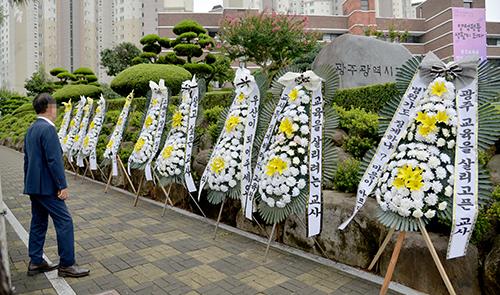 교육부가 \'서이초 교사 추모 9·4교권멈춤의 날\'을 불허한 가운데 30일 오후 광주 서구 광주시교육청 입구에 교육부 등을 규탄하는 교사들의 조화가 놓여 있다. 2023.08.30.