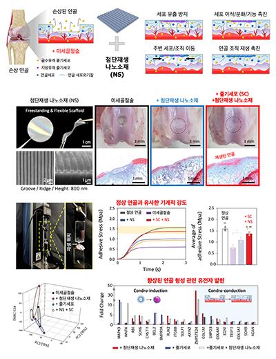 또 첨단 재생 나노소재에 줄기세포를 함께 이식했을 때 연골세포 분화, 성장인자 분비, 세포외기질이 형성되고 재생된 연골이 정상적인 연골과 유사한 구조와 기계적 강도를 가질 수 있음도 증명했다.