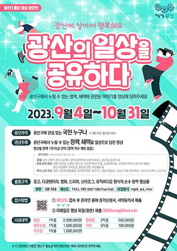 공모 기간은 9월 4일부터 10월 31일까지다. 실제 생활하며 누릴 수 있는 광산구의 정책, 혜택 등을 주제로, 일상을 담은 영상을 모집한다.