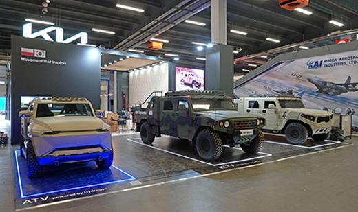 올해 기아는 유럽 지역 최초로 ‘수소 ATV(수소동력 경전술차량) 콘셉트카’를 공개하고 소형전술차량 ‘4인승 카고 트럭’과 ‘박격포 탑재차’를 함께 전시한다.