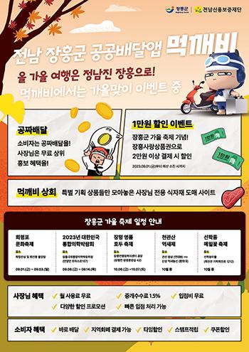 이번 할인 행사는 장흥군 가을축제 홍보와 공공배달앱 사용률을 높이고 가맹점을 확대하기 위해 마련했다.