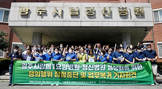 보건의료노조 광주시립요양정신병원지부는 6일 오후 광주 광산구 광주시립제1요양병원에서 기자회견을 열어 \"광주시의 공공의료 지원 기준 마련과 관련 조례 정비 약속에 병원 측의 전향적인 입장을 기대하며 업무에 복귀한다\"며 이같이 밝혔다.