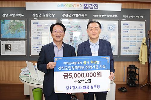 정호경 치과원장이 5일 강진군청 군수실에서 장학금 500만원을 강진군민장학재단에 기탁했다.