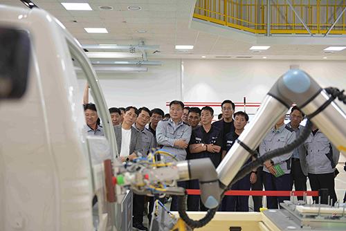 기아 AutoLand 광주에서 열린 E-FOREST 테크데이’ 행사에 참석한 박래석 기아 AutoLand광주공장장을 비롯한 임직원들이 행사장에 전시된 신 제조기술 전시물을 살펴보고 있는 모습. /기아 제공