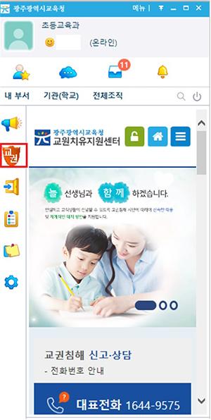 광주시교육청이 교사의 교육활동을 보호하고 이를 지원하기 위해 ‘교직원 소통 메신저(GEN)’에 ‘교권’ 창구를 개설하고 방패 모양의 바로가기 아이콘을 배치했다.