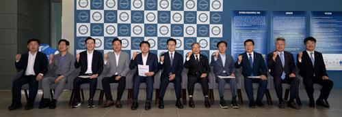 더불어민주당 당직자들이 11일 오후 나주시 한국에너지공대 본관에서 현장답사에 앞서 기념사진을 촬영하고 있다.